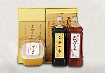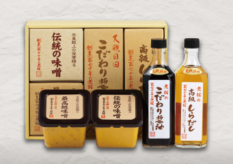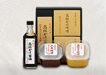 バランスのとれた味わいの『高級かけ醤油』、米の量が多くまろやかな『高級合わせ味噌』、麦味噌を長期熟成させ旨みを深めた『長期熟成三年味噌』をセットにしました。