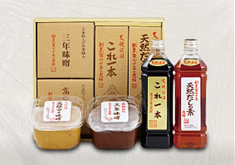 お料理の幅が広がる『これ一本』と『天然だしの素』、麦味噌を長期熟成させた旨みの強い『長期熟成三年味噌』、純国産原料の『高級合わせ味噌』を詰め合わせました。