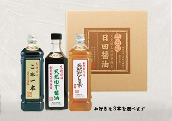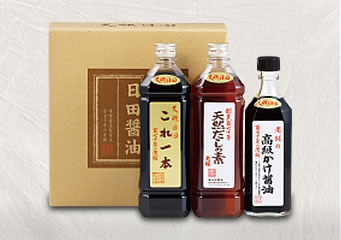 幅広く使える万能醤油『これ一本』、 まろやかで深いコクのある万能だし『天然だしの素』、 マイルドでバランスのとれた味わいの 『高級かけ醤油』をセットにしました。