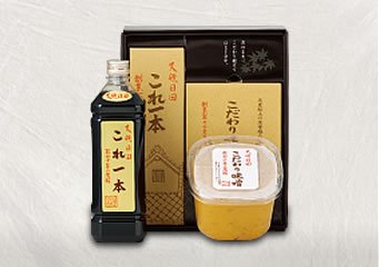 かけ醤油にも煮物にも使える『これ一本』と、 大分産大麦と佐賀産生大豆に大分産米を合わせた マイルドで深みのある味わいの『こだわり味噌』を詰め合わせました。