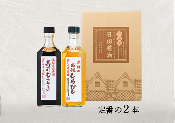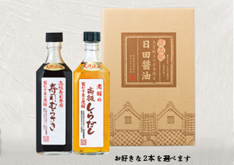 幅広く使える醤油『これ一本』、 お刺身に最適『高級寿司むらさき』、 マイルドな『こだわり醤油』、 天然だしを加えた食卓用『高級かけ醤油』、 ポン酢としても使える『天然ゆず醤油』、 万能醤油『高級しらだし』、 高級万能だし『天然だしの素』、 この中から2本を選べる醤油&だしセット。