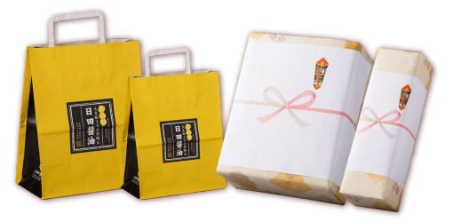 お刺身に最適、割醤油やかけ醤油にも使える『高級寿司むらさき』+うすくち醤油に昆布だしを合わせた『高級しらだし』、 2本を詰めた定番醤油ギフト。
