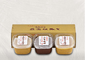 バランスのとれた味わいの『高級かけ醤油』、米の量が多くまろやかな『高級合わせ味噌』、麦味噌を長期熟成させ旨みを深めた『長期熟成三年味噌』をセットにしました。