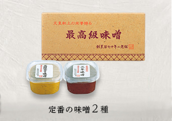 クリーミーでまろやかな味わい『高級合せ味噌』、 旨み豊かな熟成麦みそ『長期熟成三年味噌』、 の2種を詰め合わせた、定番セット。 「高級合せ味噌」「長期熟成三年味噌」各1点