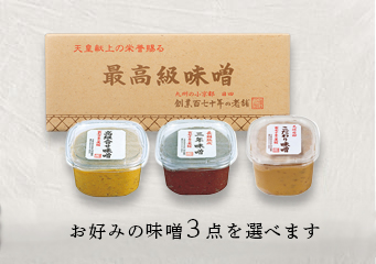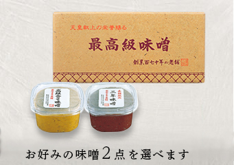 深みのある味わい『こだわり味噌』、 まろやかな味わい『高級合せ味噌』、 旨み豊かな熟成麦みそ『長期熟成三年味噌』、 豆味噌を加えた『赤みそ』、 米の味が豊かに広がる『伝統の味噌』、 厳選米を増やしたまろやかな逸品『最高級味噌』、 深い旨味とコクを醸す『赤だし』、 から2個を選べる味噌ギフト。